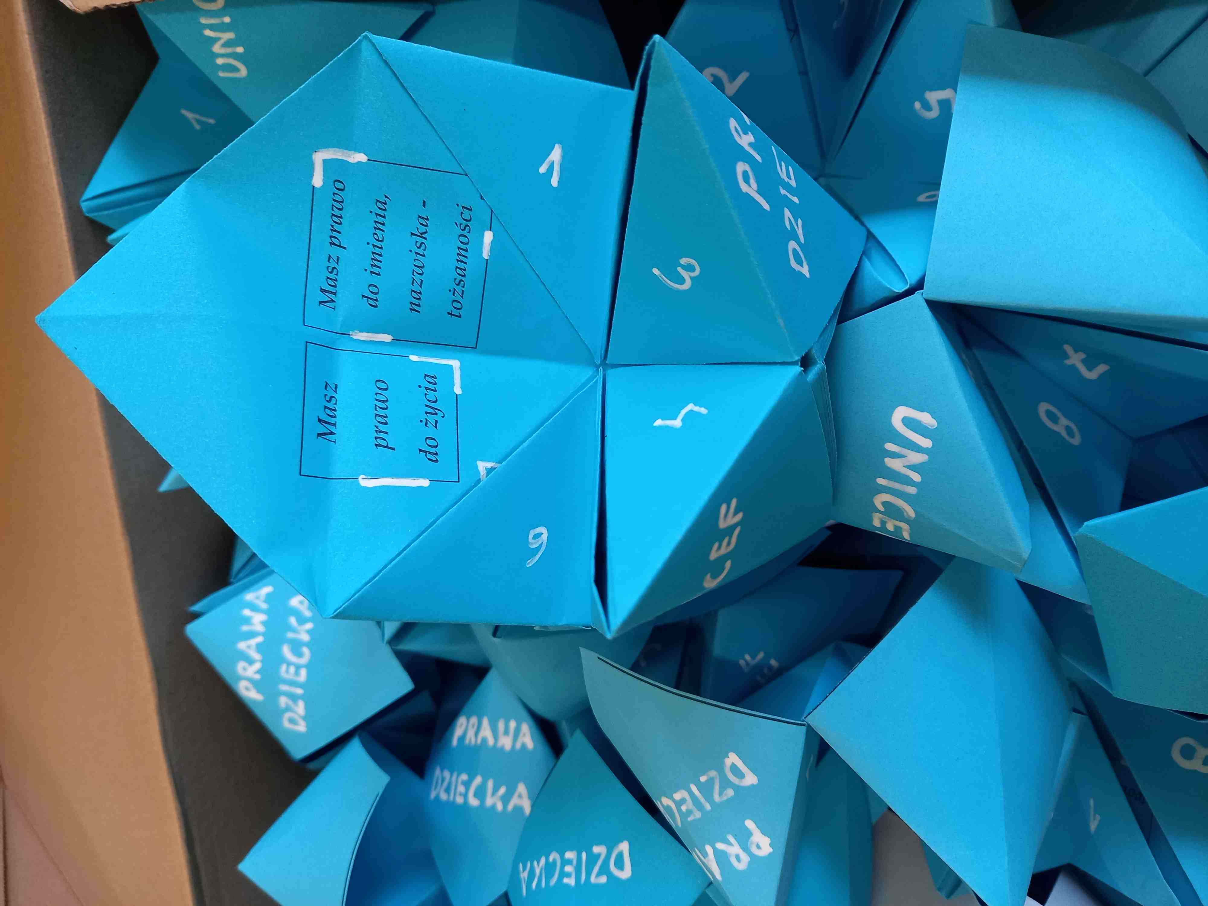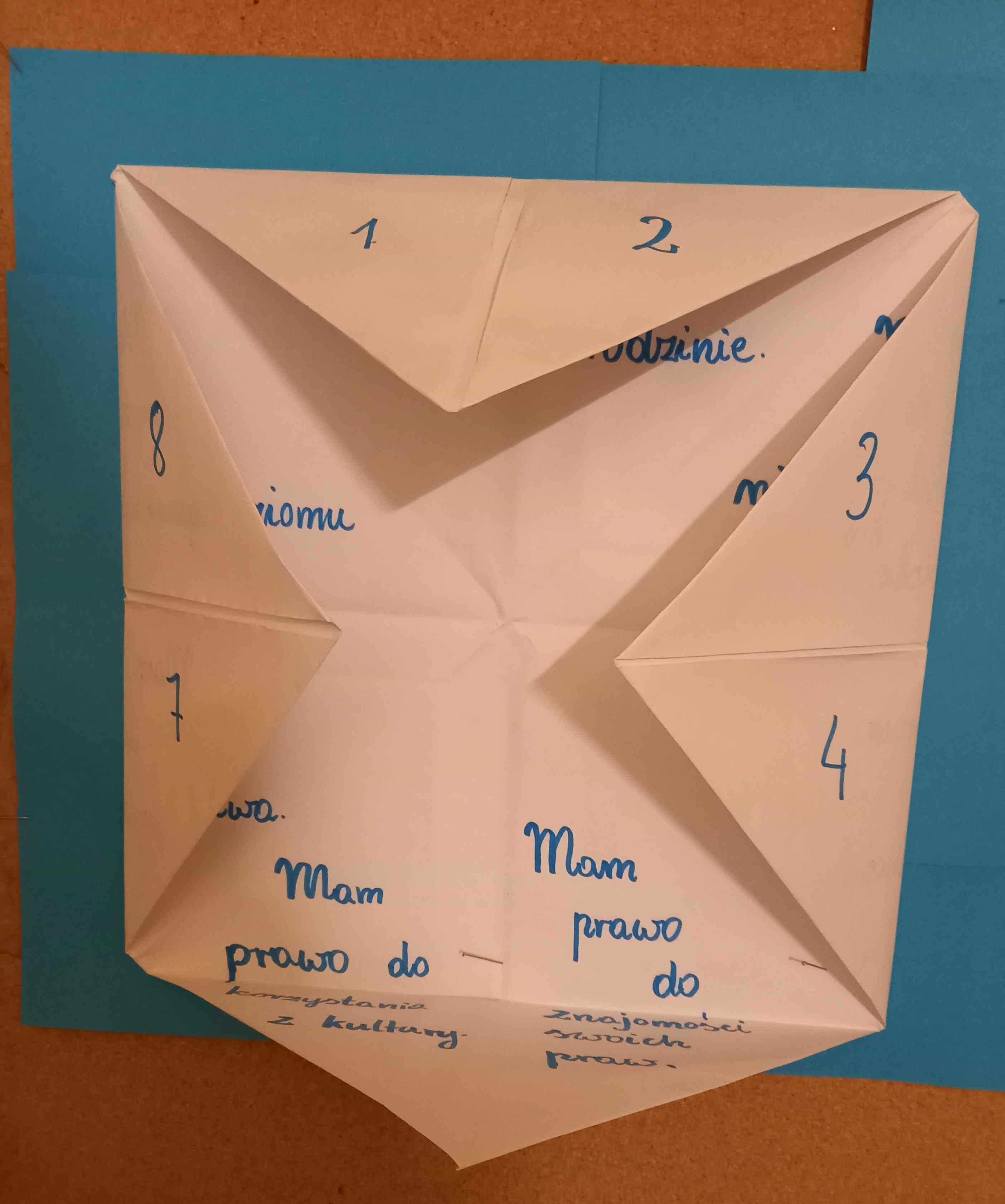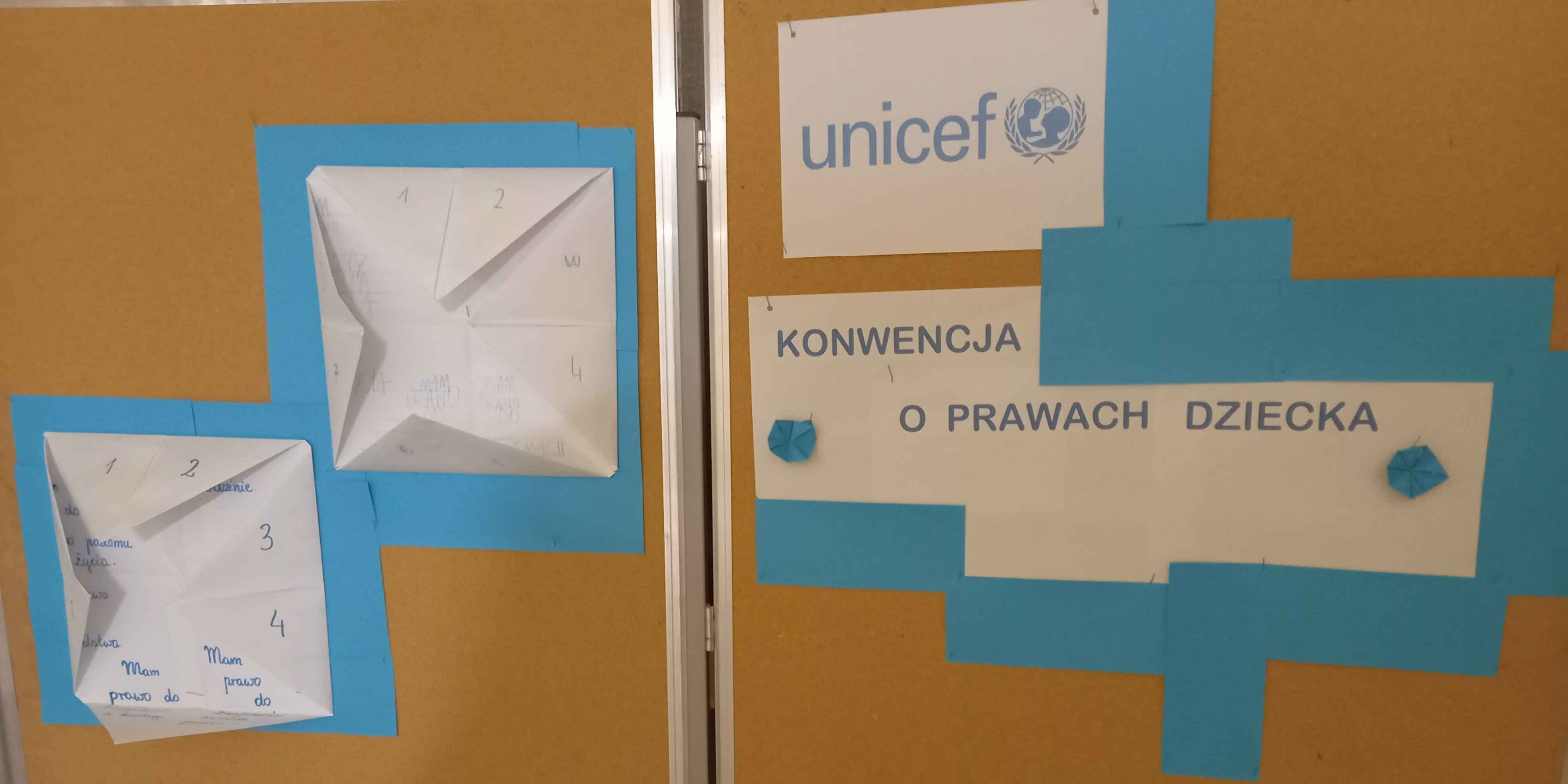 Ostatni tydzień był bardzo pracowity dla nielicznej grupy chętnych uczniów z klas IV-Vb, c. Przygotowali blisko 100 papierowych układanek typu 'piekło-niebo" z wydrukowanymi prawami dziecka. W korytarzu starszych klas zawisła mini wystawa informacyjna w kolorach UNICEF-u organizacji, agendy ONZ działającej na rzecz dzieci.