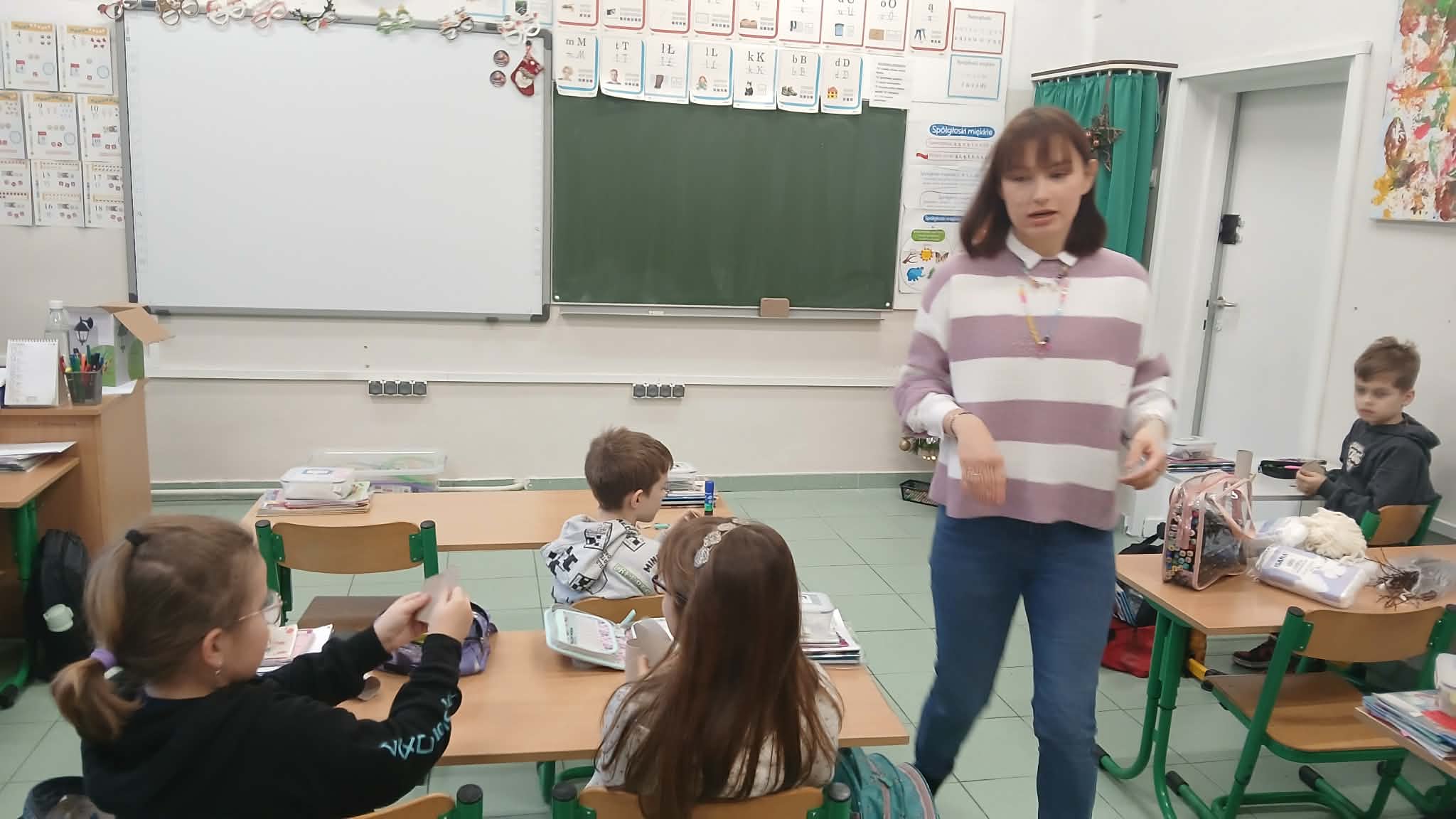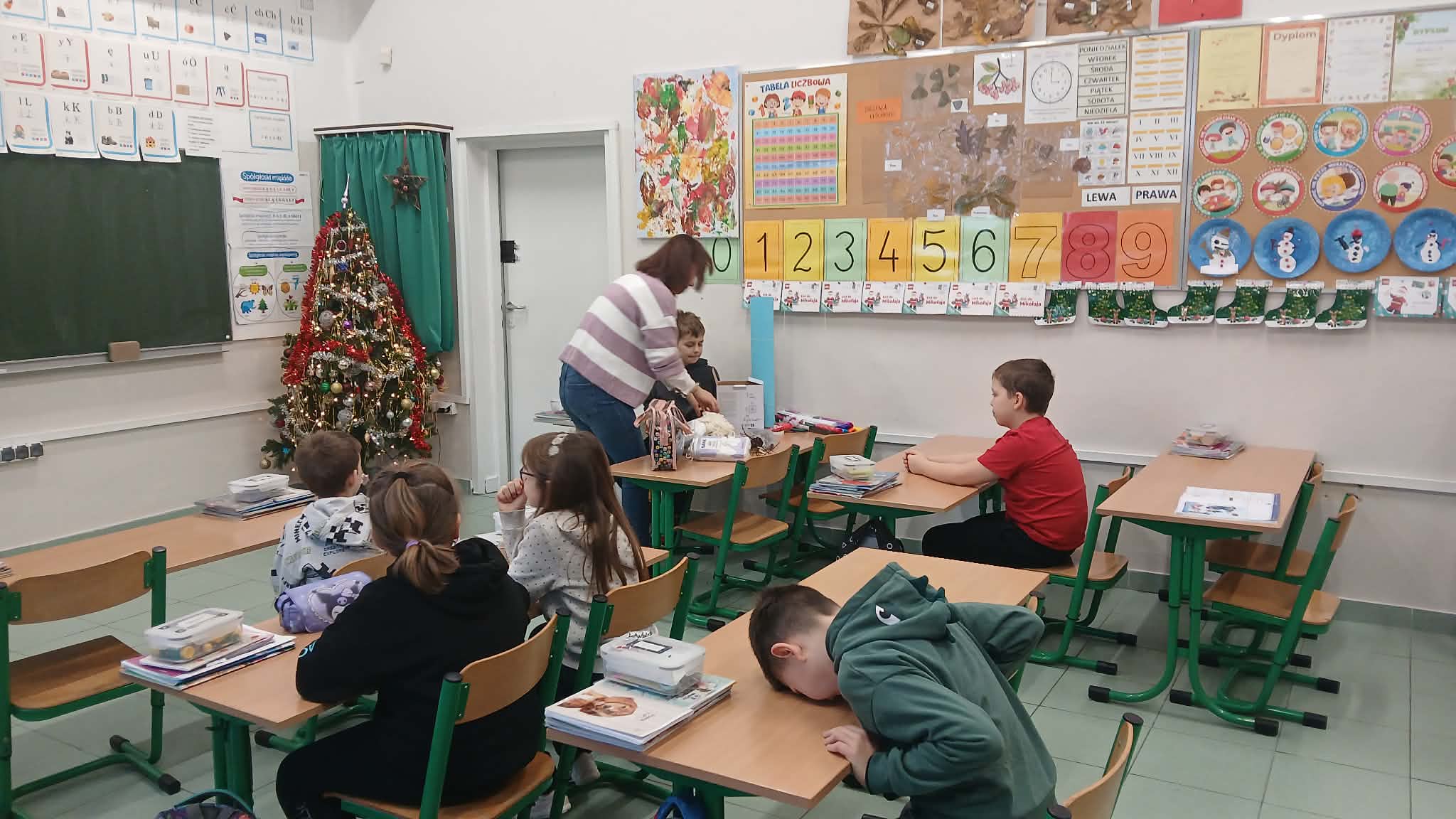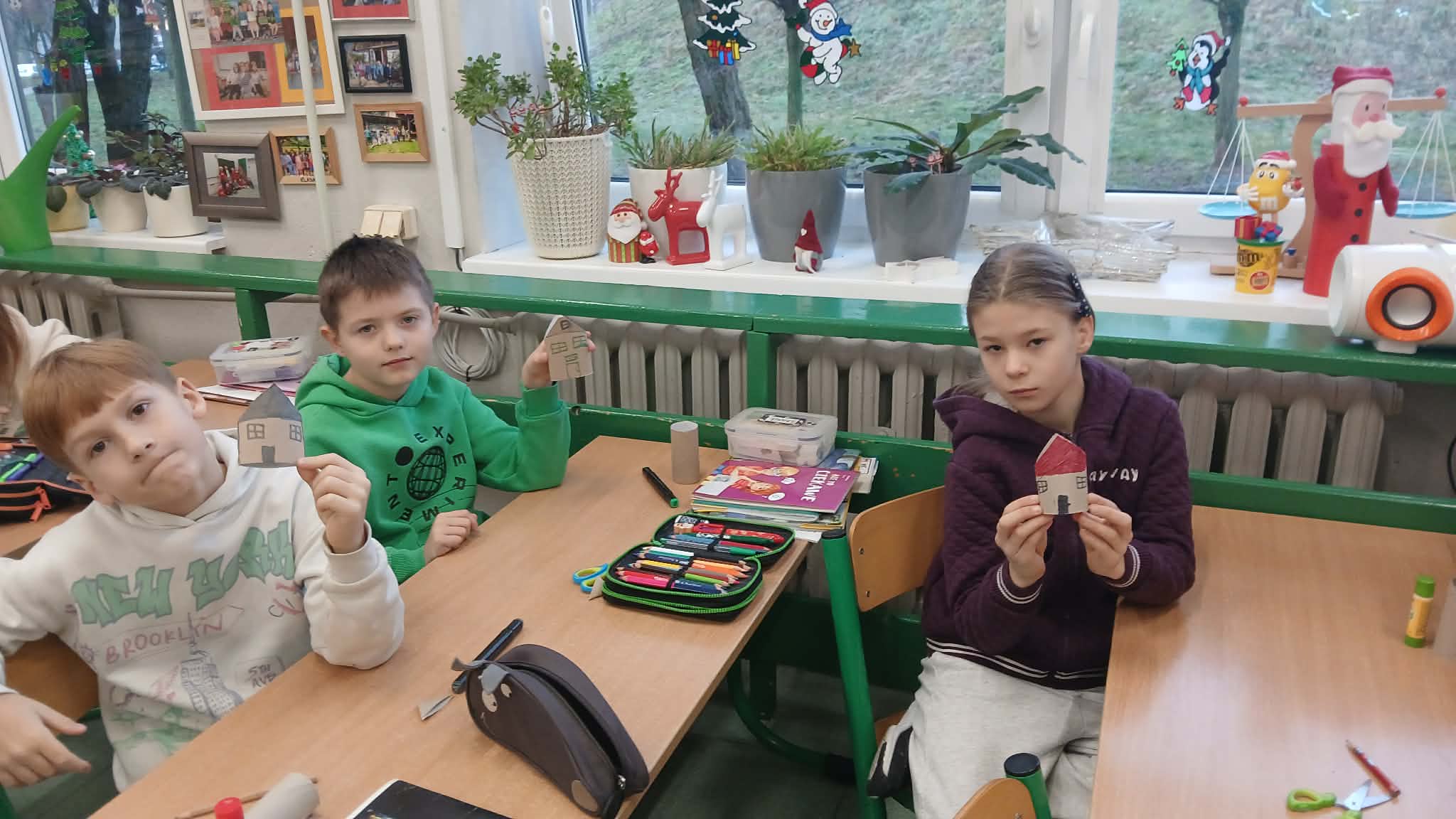 Tuż przed świętami, uczniów klasy 2b odwiedziła studentka. Dzieci wykorzystały papierowe rolki od papieru toaletowego i wykonały piękne domki. Wszystkie domki stworzyły bajeczne, zimowe miasto.