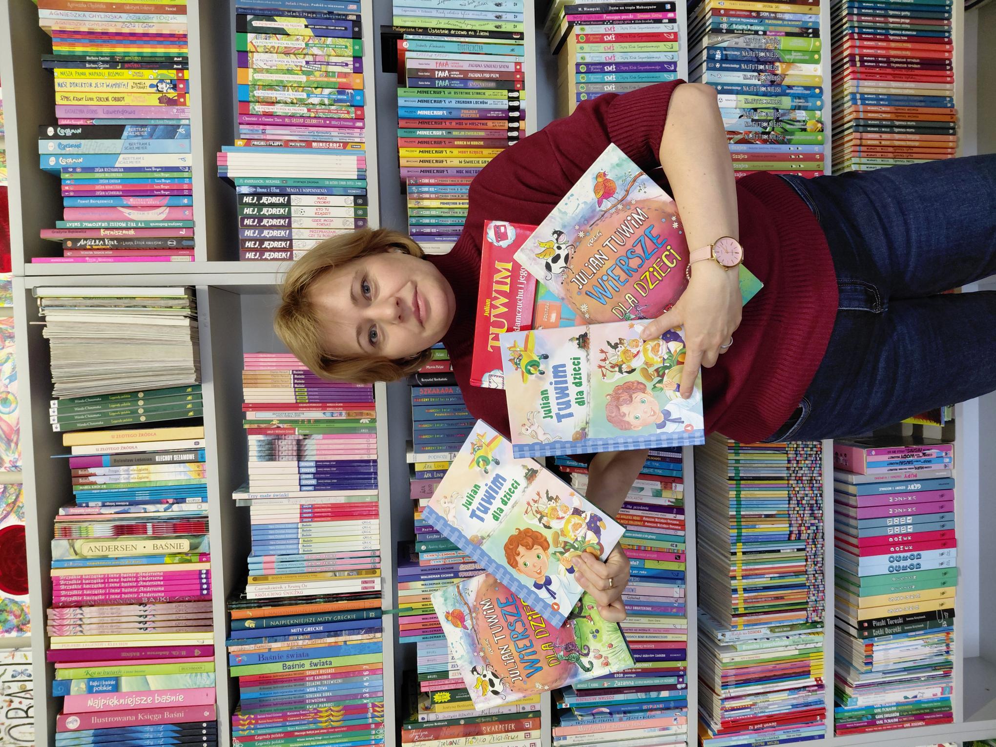 Na zdjęciu p. Filipczak z wybranymi książkami Julina Tuwima, które są do wypożyczenia w bibliotece szkolnej i czekają na uczniów.
