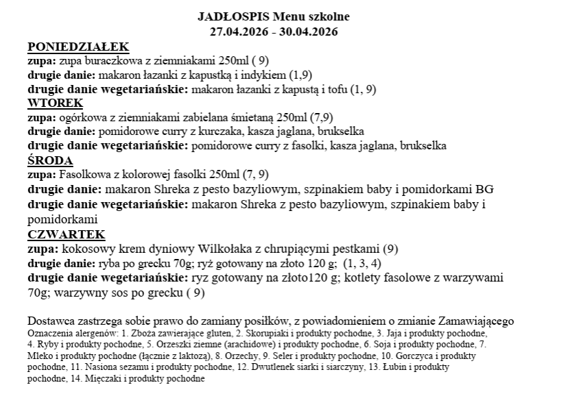 Jadłospis 27.04 - 30.04