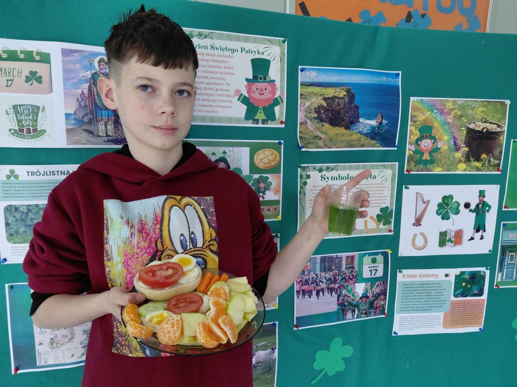 Przez cały tydzień uczniowie angażowali się w różnorodne działania edukacyjne i kreatywne. Na zajęciach języka angielskiego poznawali historię św. Patryka, symbole związane z Irlandią, takie jak koniczyna czy leprechauny, a także ciekawostki dotyczące Zielonej Wyspy. Nie zabrakło również elementów multimedialnych – uczniowie oglądali filmy, prezentacje oraz tworzyli własne materiały.