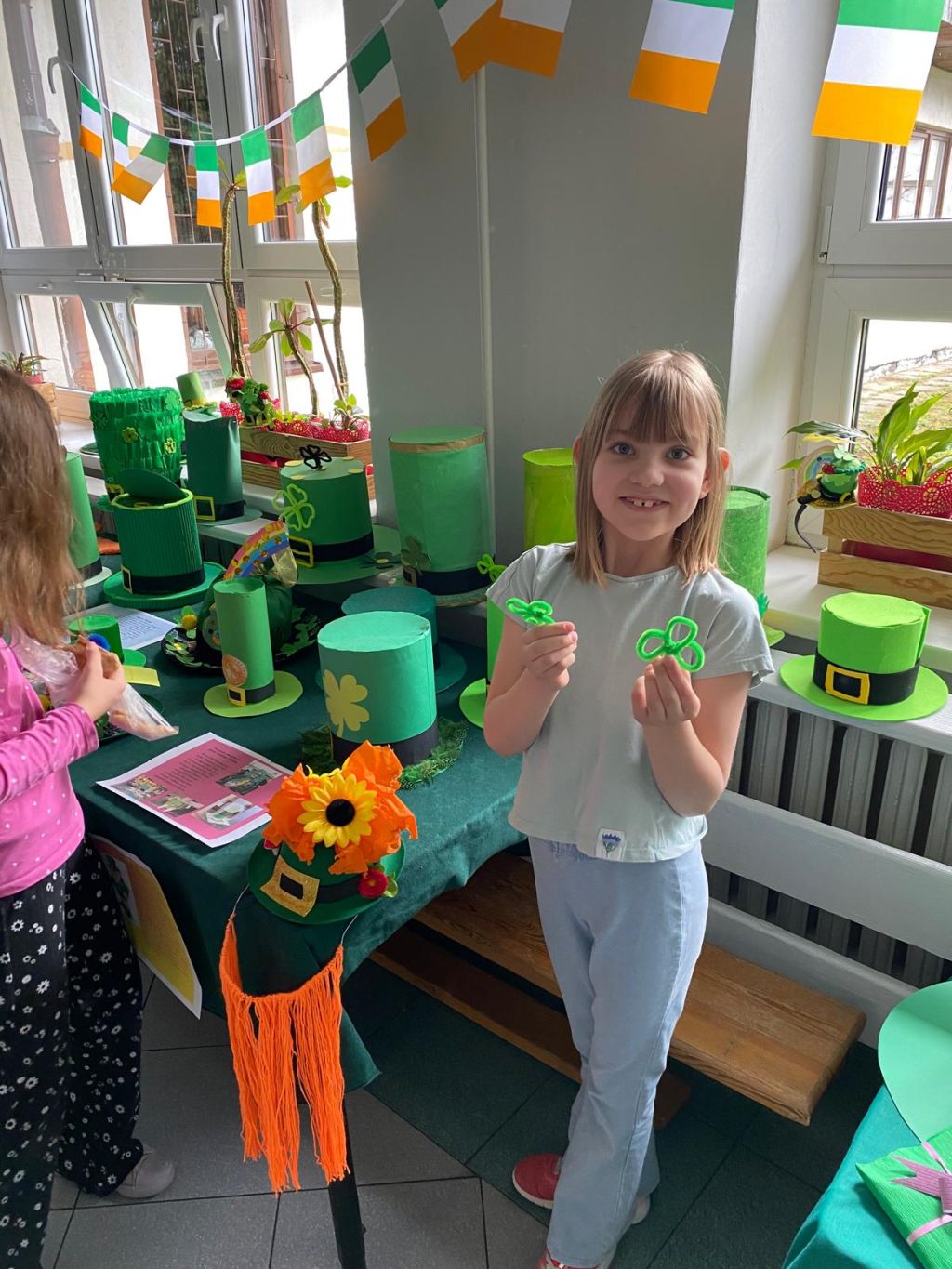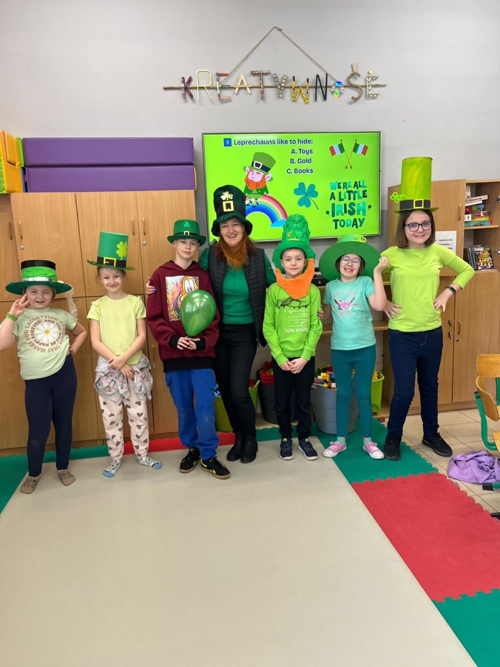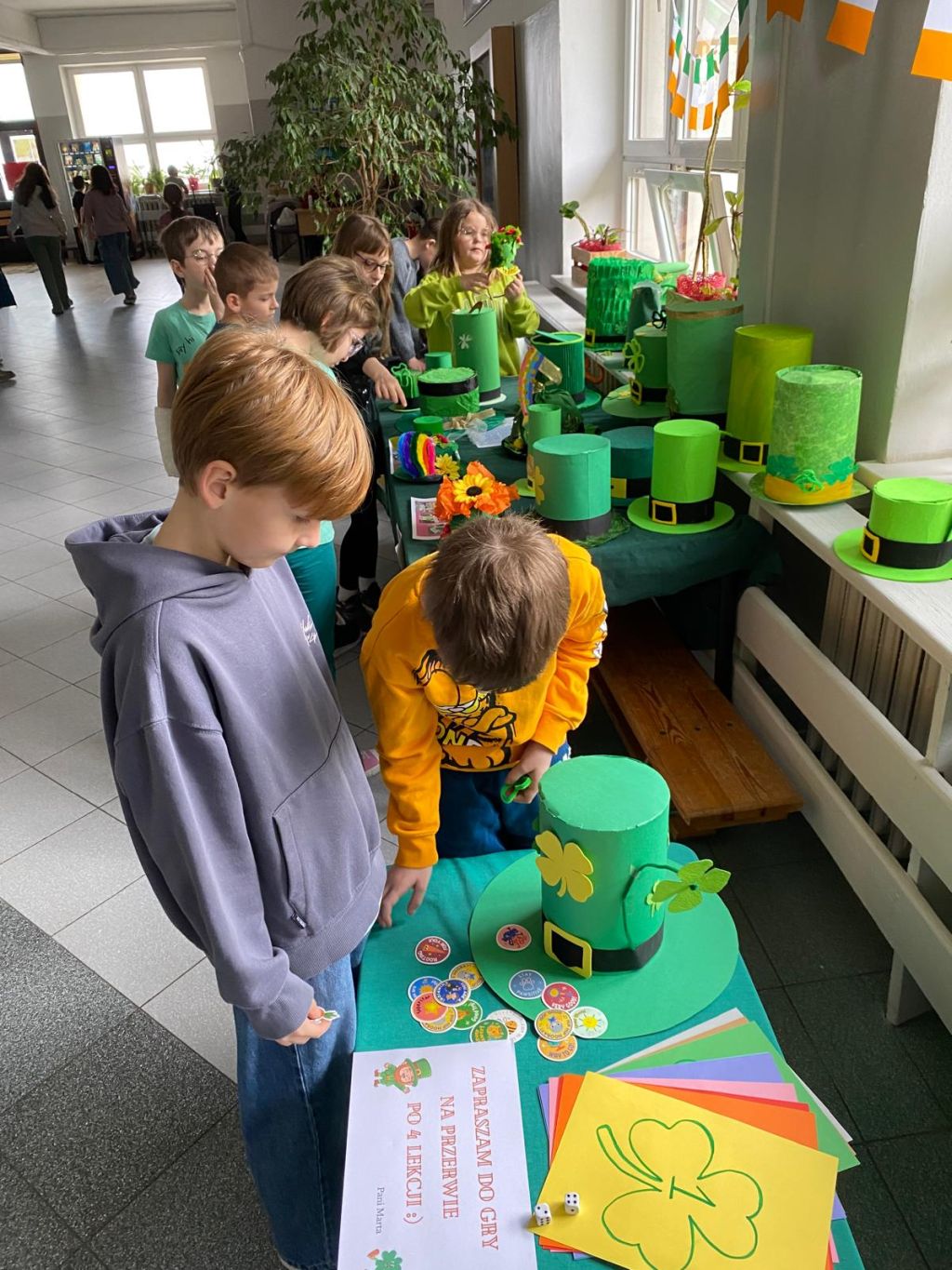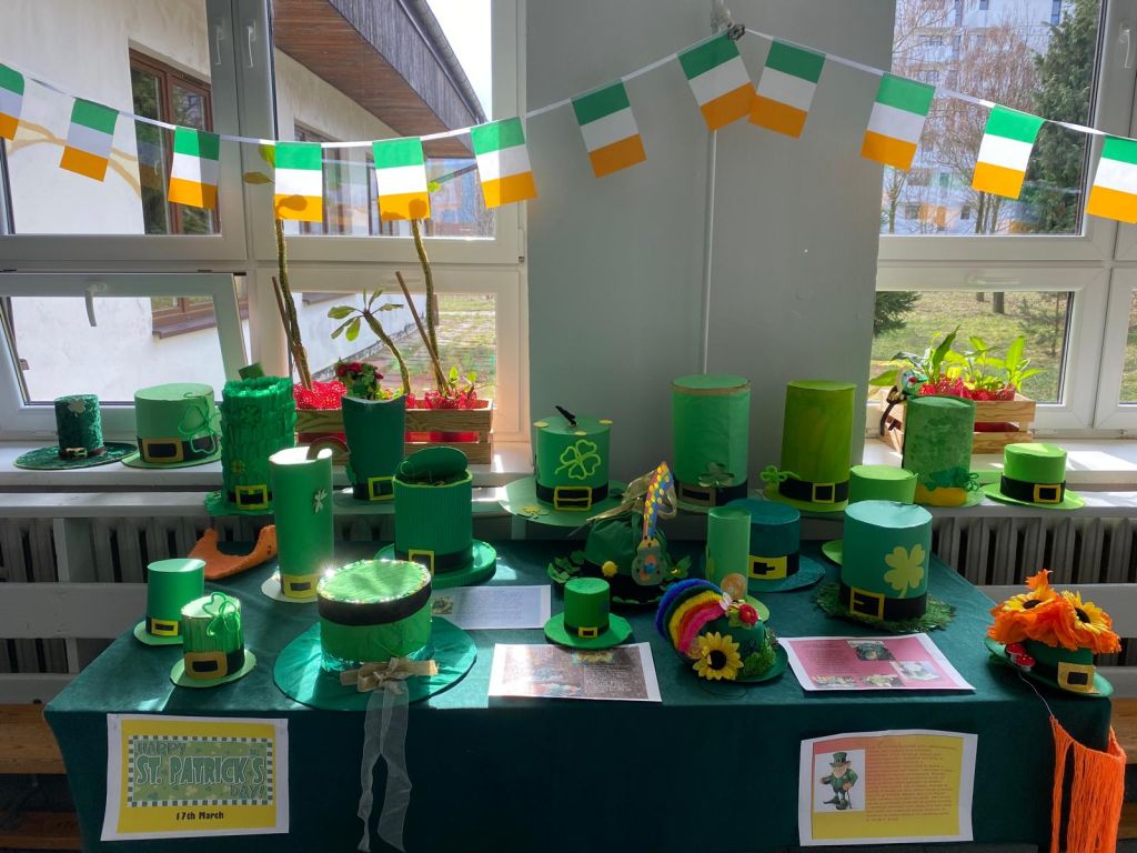 Szczególną atrakcją była także wystawa kapeluszy leprechaunów, wykonanych przez uczniów z ogromną pomysłowością i dbałością o detale.