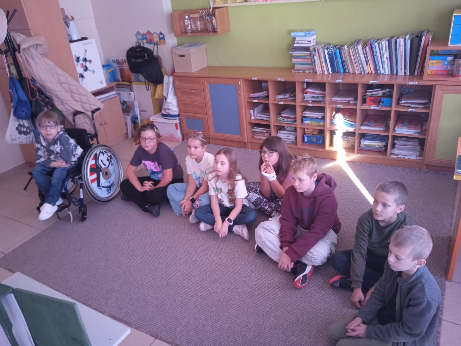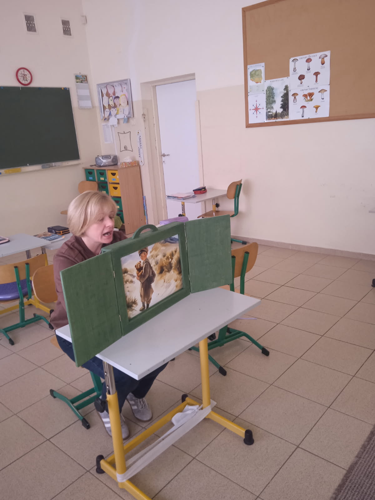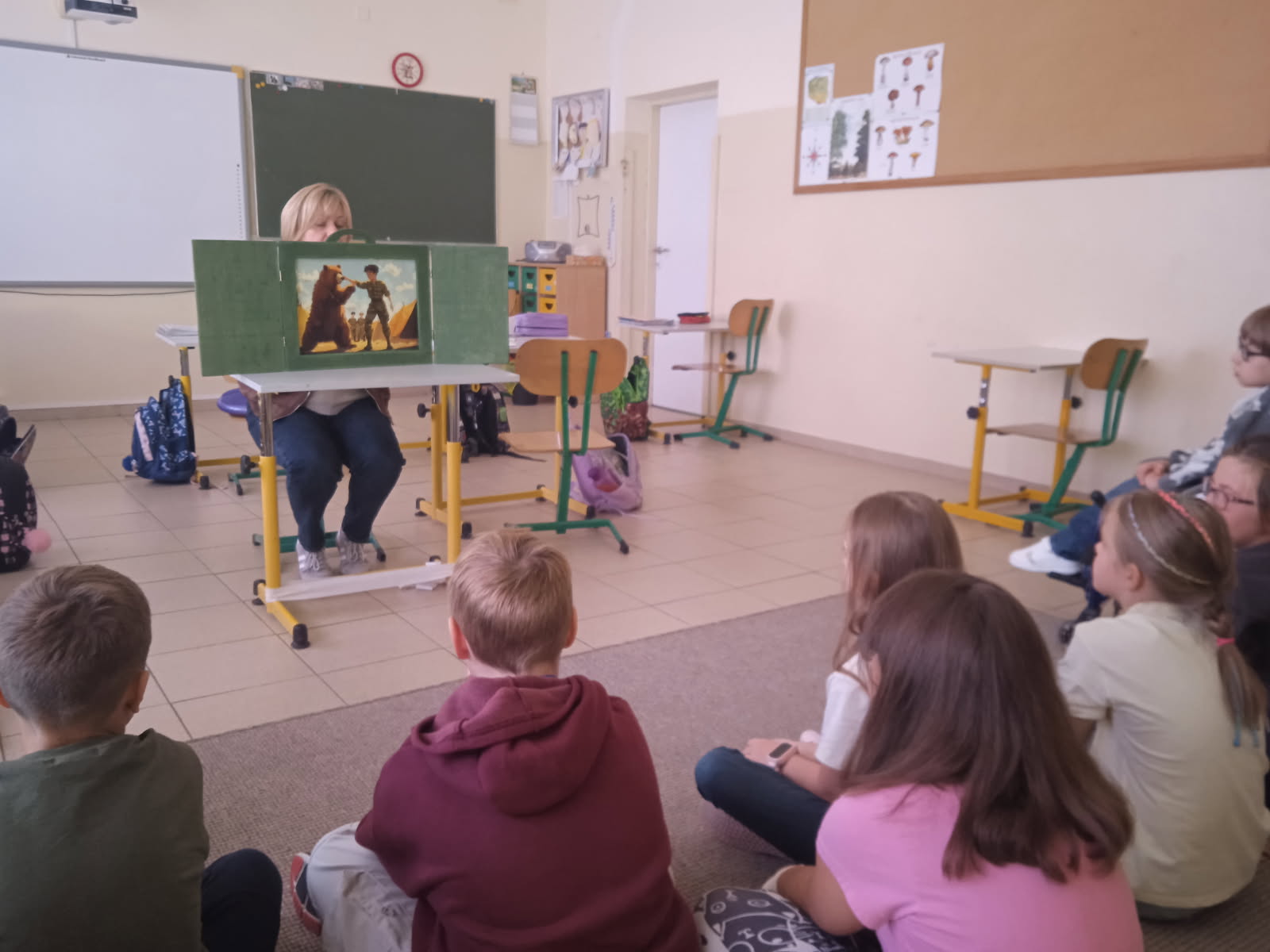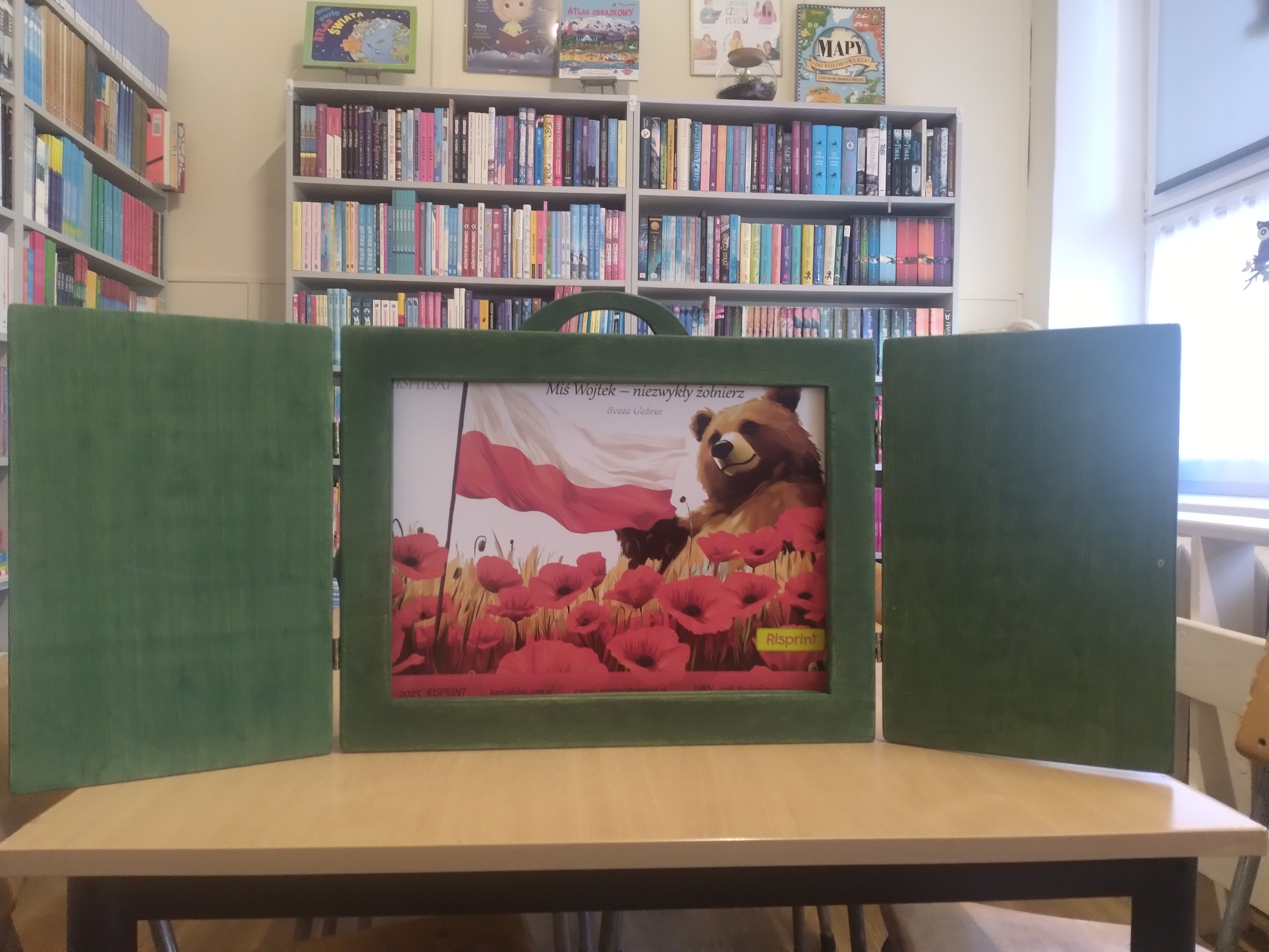 Uczniowie klas III w niekonwencjonalny sposób poznawali swoją lekturę szkolną pt. "Dziadek i niedźwiadek" autorstwa Łukasza Wierzbickiego. Nauczyciel bibliotekarz przybliżył uczniom historię niedźwiedzia Wojtka przy pomocy kart opowieści do Teatrzyku Kamishibai.